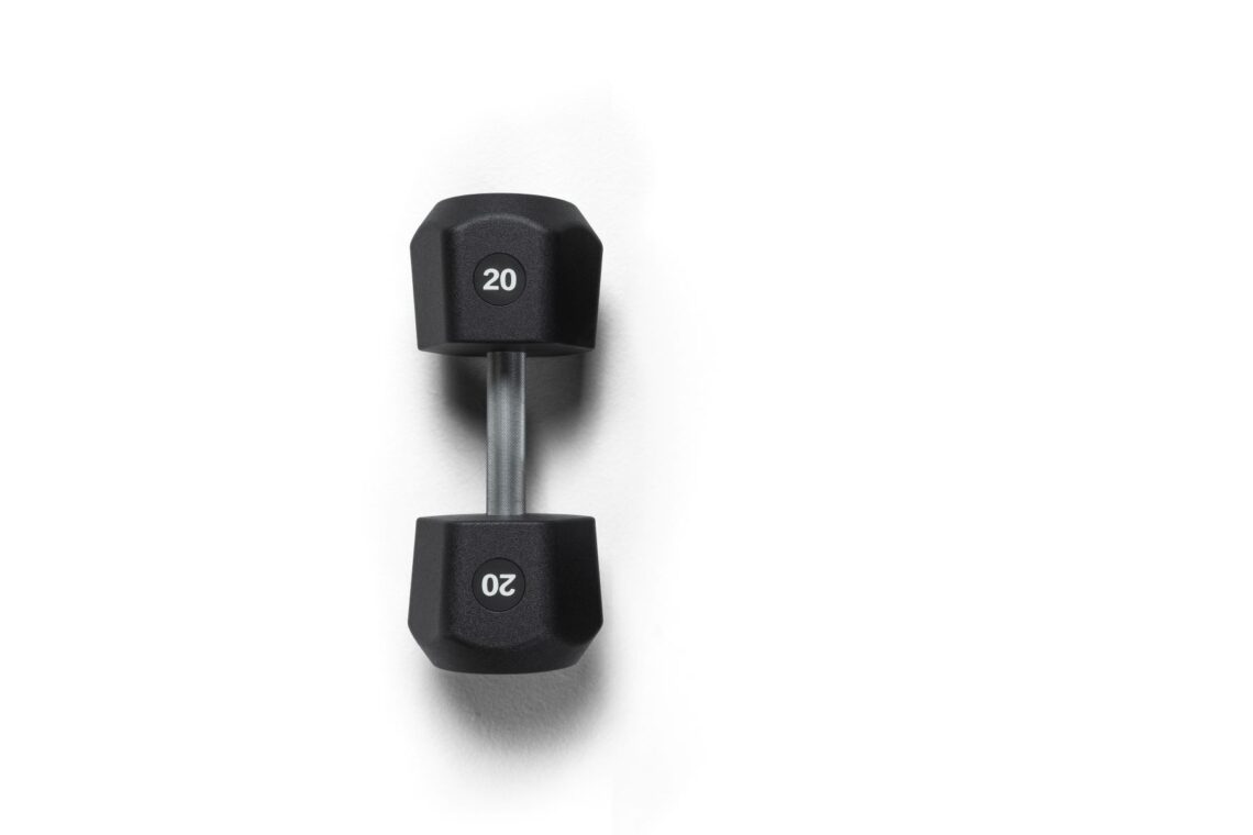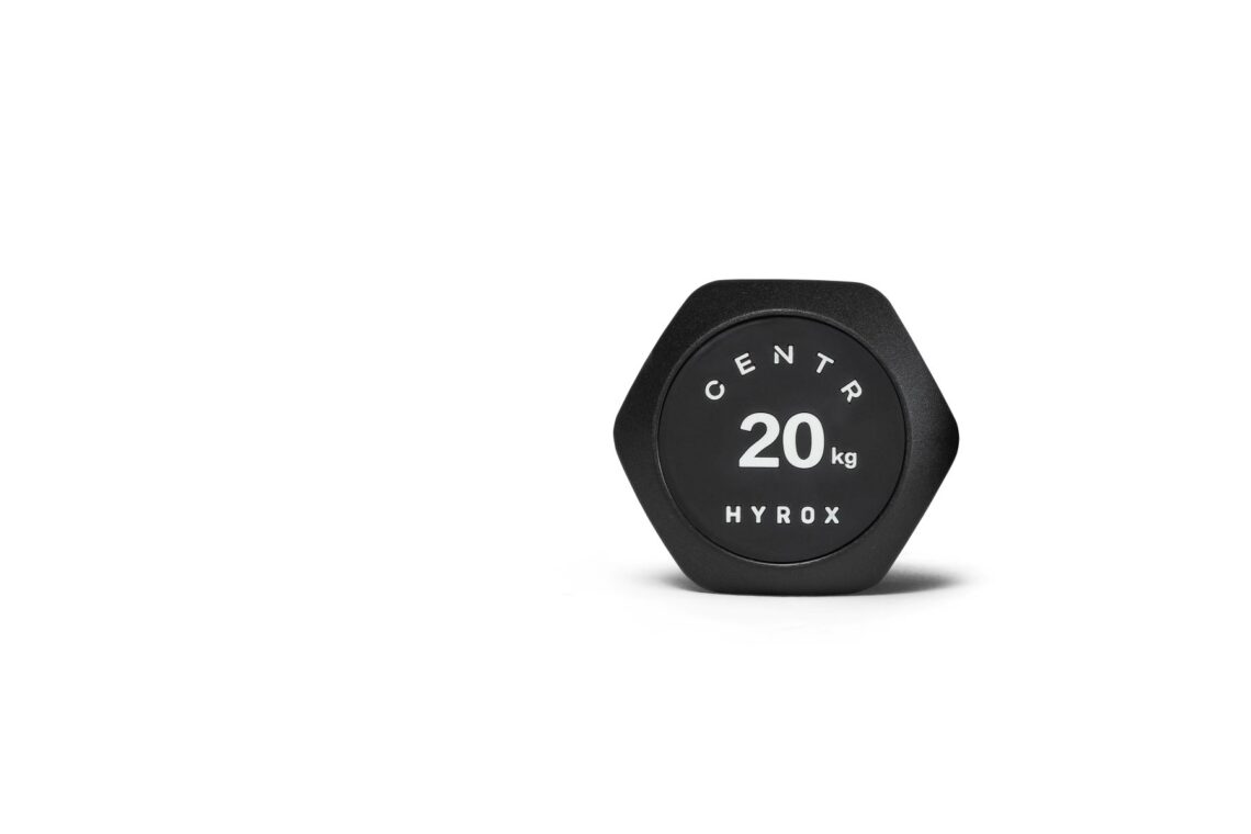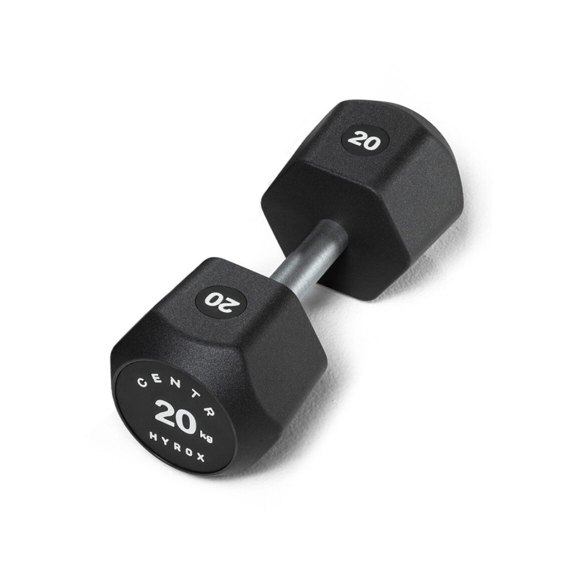 CENTR x HYROX uretanska bučica, fiksna težina 20 kg (≈ 44,1 lb). Konfigurirana za funkcionalni trening i trening u HYROX stilu s naglaskom na ponovljivo rukovanje, stabilnost i dugotrajnost materijala u klasi većeg opterećenja.