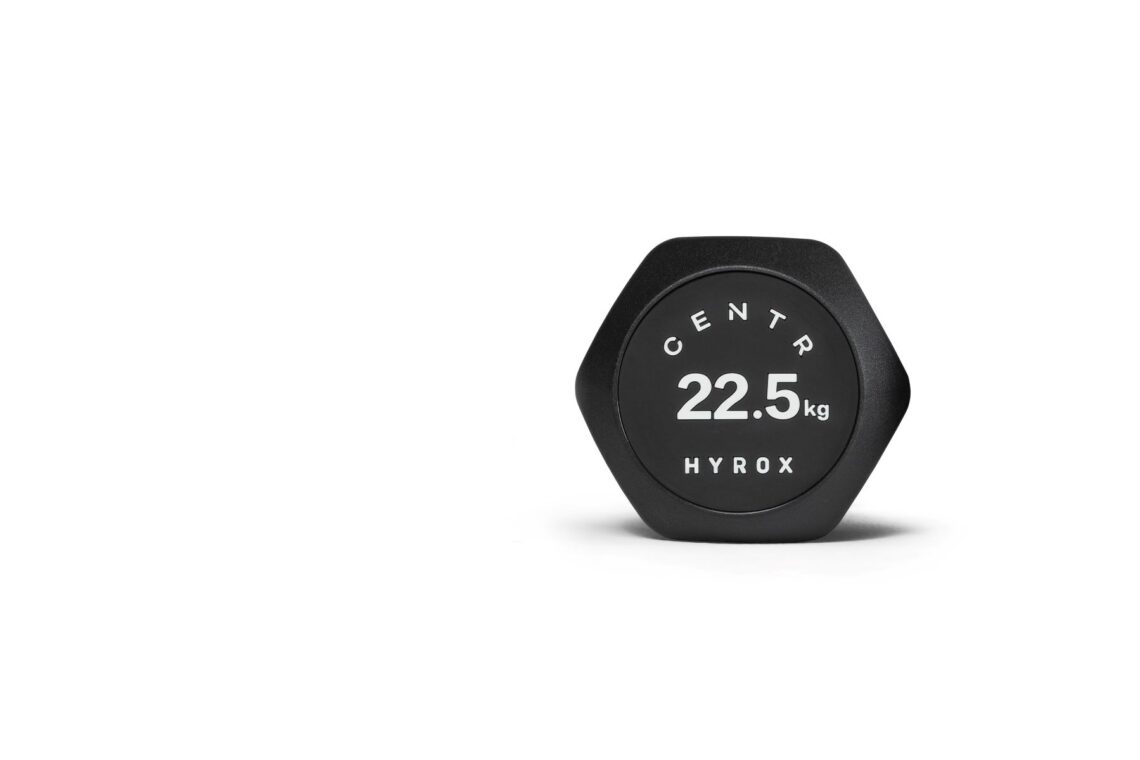 CENTR x HYROX uretanska bučica, fiksna težina 22,5 kg (≈ 49,6 lb). Konfigurirana za funkcionalni trening i trening u HYROX stilu s naglaskom na ponovljivo rukovanje, stabilnost i dugoročne performanse materijala pri specifikaciji većeg opterećenja.