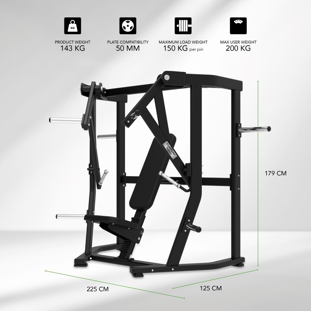 Wide Chest Press Plate Loaded usmjeren je na vanjski dio prsa i ramena za snažnu izgradnju muskulature. Širi hvat smanjuje opterećenje tricepsa i naglašava razvoj prsa.